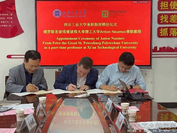 人事处处长高巍,惠增哲与Anton A.Naumov签订兼职教授聘任协议。刘卜为Anton A.Naumov颁发我校兼职教授聘书、并佩戴校徽。