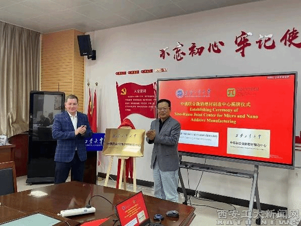 国际交流与对外合作处处长张冬敏介绍中俄合作情况,表示我校从2018年开始与俄罗斯圣彼得堡彼得大帝理工大学进行学术上的交流。惠增哲与Anton A.Naumov共同为中俄联合微纳增材制造中心揭牌。