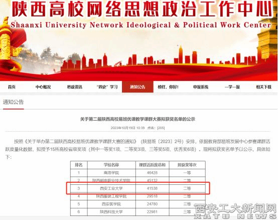 (本网讯)日前,为深入学习贯彻党的二十大精神,按照教育部等十部门《全面推进“大思政课”建设的工作方案》要求,陕西省高校易班发展中心组织开展第二届陕西高校易班优课教学课群大赛。我校易班发展中心积极响应、精心策划,在全省12所高校的30个参赛课群中表现突出,报送的《学习二十大,西工学子在行动》优课课群获得第二届陕西高校易班优课教学课群大赛二等奖。