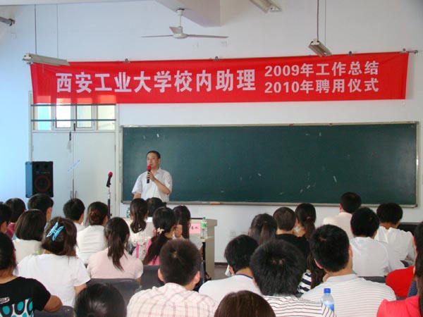 副校长张君安讲话对我校的校内助理工作开展情况与国外开展的学生岗前实践活动进行了对比。他指出:我校开展的此项工作是与时俱进和社会发展的产物,能够很好的帮助学生顺利实现从学生到社会人的转变,使学生尽快适应社会、自食其力,成为有用之才。他对2009年服务期满的全体校内助理为学校做出的贡献表示感谢,对2010年聘用的校内助理提出殷切期望。希望全体校内助理向2009年考核优秀的学生学习,坚定信念,确定自身的成才坐标,并且不断努力实现目标;在工作岗位上勤于思考,勇于实践,在社会大学中了解基层,提高工作水平和能力;不惧怕失败,积极总结经验,早日取得成功。