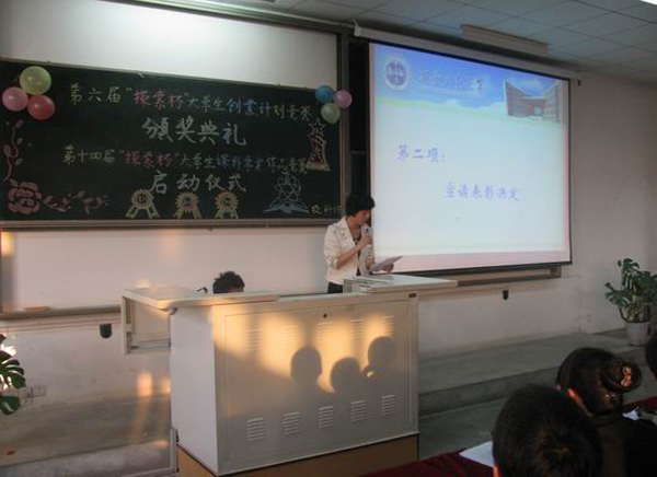 颁奖典礼结束后,我校第十四届“探索杯”大学生课外学术作品竞赛正式启动。首先,团委赵伟奇老师做了宣传动员,他结合我校历年参赛情况分别从大赛简介、大赛整体安排、参赛作品要求等方面进行了详细讲解,并鼓励同学们积极参赛。随后,上届获奖者学生代表李鹏和杨阳两位同学讲述了他们的参赛经历,同时也向在场同学传授了比赛经验。