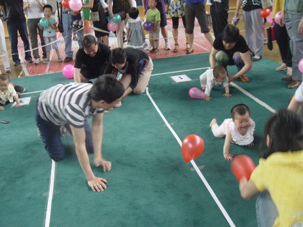 本次活动设置了“看谁爬得快”、“小脚踩大脚”、“亲子接力赛”三个亲子活动项目,具有较强的参与性和趣味性,得到宝宝和家长们的认同和喜爱。在“看谁爬得快”项目中,这些从刚会抬头到蹒跚走路的小选手们似乎还不明白比赛的规则,家长们各种招式层出不穷,比赛场上的表现千姿百态,令人忍俊不已。