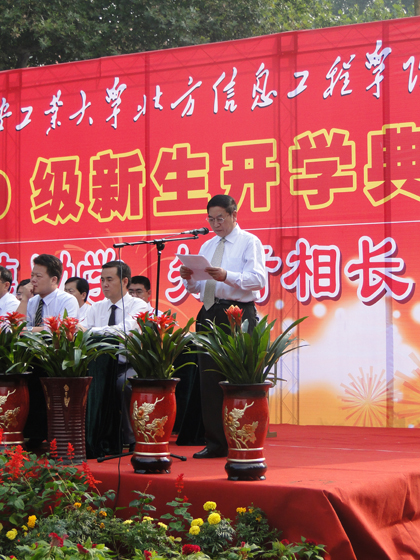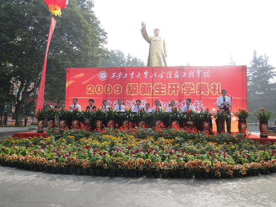 (本网讯)9月2日上午,必赢bwin线路检测中心北方信息工程学院美丽的校园里彩幅飞舞,彩球飘场,到处都充满着欢庆的气氛,学校隆重举行2009级开学典礼。西安工大校长、北信学院董事长刘江南,西安工大副校长、北信学院董事张君安出席大会;北信学院党委书记简林根、党委副书记王大明、副院长李建安、薛虹,学院各处室负责人及部分教师出席大会,全体2009级新生参加了开学典礼。会议由院长办公室主任张雅泉主持。