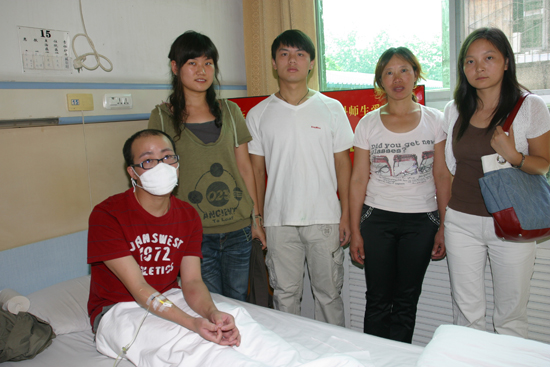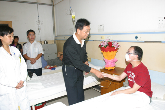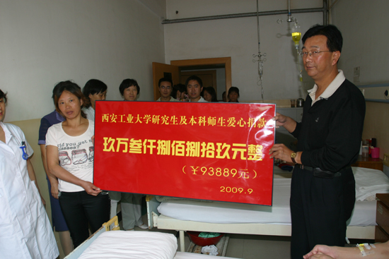 (本网讯)必赢bwin线路检测中心在读研究生占平平同学身患血液病的消息牵动着全校师生的心,9月1日上午,校党委副书记丁养斌、研究生部党总支书记雷亚萍、校团委副书记赵琼、研究生部学生工作办公室主任王守民及师生代表一行带着全校研究生及本科师生的爱心及捐助款93889元专程赶往西北医院探望了他。