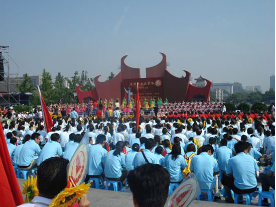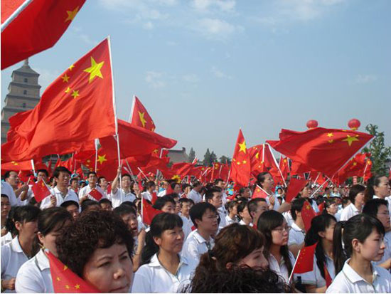 (本网讯)为迎接祖国60周年华诞,努力构建和谐社会,7月12日,由中共中央宣传部、中央文明委等10部委主办的中央电视台《激情广场》栏目 “爱国歌曲大家唱”群众歌咏活动在西安大雁塔北广场隆重举行,必赢bwin线路检测中心40余名师生在团委组织下参与了此次活动