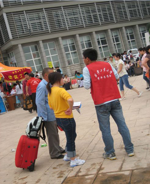 9月1日,2日是新生报道的日子,除了每个院系在经纬广场迎新接待外,校团委也组织安排青年志愿者协会的成员积极参与其中,帮助新生搬行李,向他们介绍学校的情况,新生的脸上露出了丝丝的喜悦和好奇,而家长的脸上也流露出了满意的笑容。