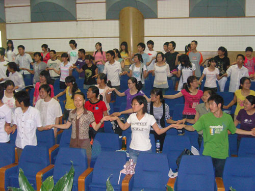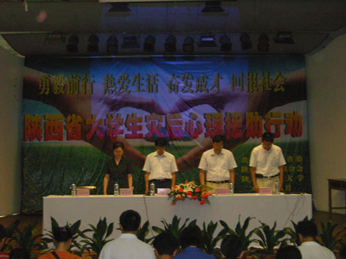 在心理援助行动的启动仪式上,团省委的领导和我省各高校的师生代表共300余人首先为地震中死难的同胞们默哀三分钟,接着通报了“在全省高校学生中开展灾后心理援助行动”的具体活动内容。之后,陕西师范大学博士生导师陈青萍教授为全省家庭受灾较重的数百名学生作了题为“地震后的心理调节策略”的心理辅导讲座。