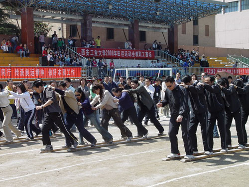 此次教职工赛场共设立了四项集体项目:赛龙舟、拍球投篮接力、步调一致、50米障碍接力,700余名教职工参加了各项比赛。大家发扬团队精神,比赛中团结一心,奋力拼搏,充分展示了西安工大教职工积极进取,顽强拼搏的良好精神风貌。通过激烈角逐,最后机电学院工会、继续教育学院、研究生部工会、材化学院工会分获团体总分一、二、三名,艺术与传媒学院工会、外语系工会获得体育道德风尚奖,校领导为获奖单位颁发了奖杯。