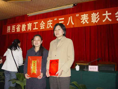 (本网讯)在3月4日陕西省教育工会举行的庆“三八”表彰大会上,我校外语系荣获2007年度陕西省教育系统“五一巾帼标兵岗”光荣称号,机电学院李平教授荣获陕西省教育系统“五一巾帼标兵”称号。校工会女教职工委员会副主任周晔被评为陕西省教育系统先进女职工干部。