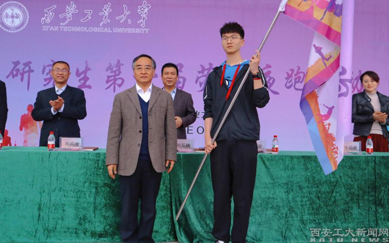 赵红星为荧光夜跑活动代表授旗。鲜亮的旗帜随风飘扬,象征着西工学子由运动所燃起的愉悦与激情。